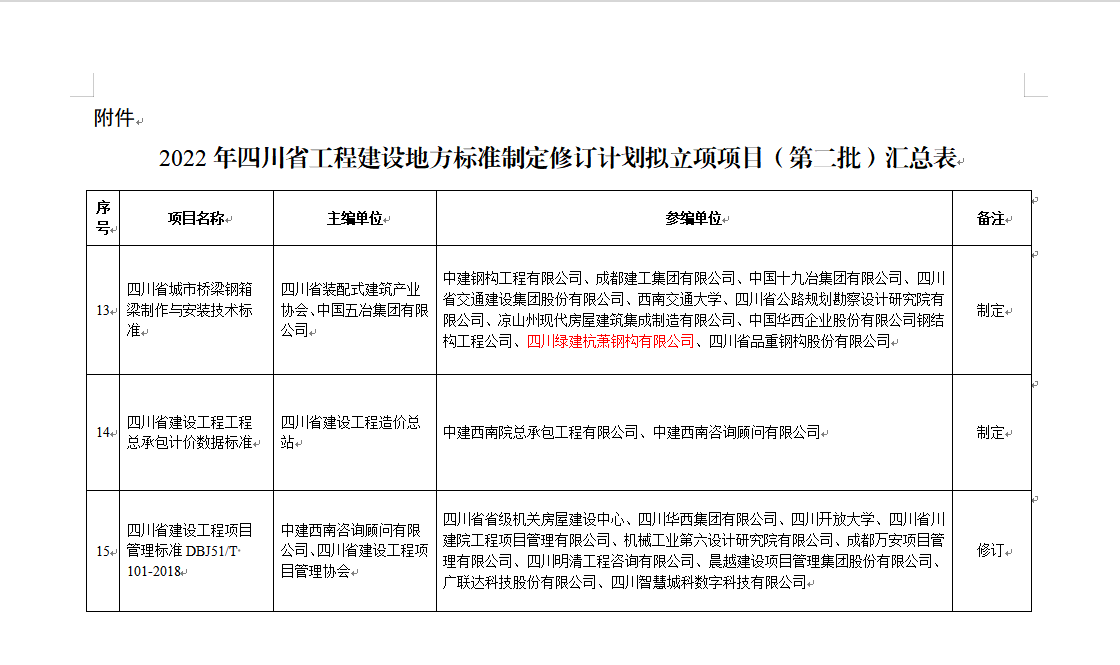 “行業(yè)標(biāo)準(zhǔn)為旗桿,科研技術(shù)為導(dǎo)向”,2022年8月22日,四川綠建杭蕭鋼構(gòu)有限公司(以下簡(jiǎn)稱:綠建杭蕭)參編的《四川省城市橋梁鋼箱梁制作與安裝技術(shù)標(biāo)準(zhǔn)》在四川省住建廳官網(wǎng)進(jìn)行公示。這是繼“中國(guó)鋼結(jié)構(gòu)協(xié)會(huì)”會(huì)員單位、第二批天府綜改企業(yè)之后,同年再次獲得的殊榮。綠建杭蕭在行業(yè)領(lǐng)域標(biāo)準(zhǔn)中發(fā)出了自己的聲音!